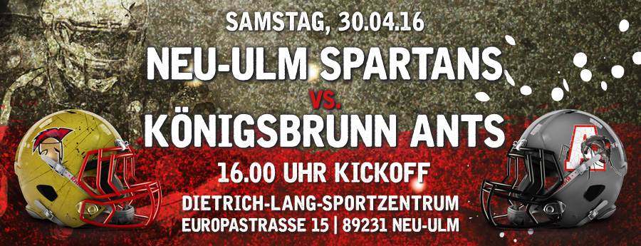 Die American Football-Saison steht in den Startlöchern. Zum Kickoff der Regionalliga-Saison 2016 empfangen die Neu-Ulm Spartans am Samstag, 30.04.16, um 16Uhr die Königsbrunn Ants. Nach den Relegationsspielen vergangene Saison hat man beim TSV Neu-Ulm ambitionierte Ziele, doch unterschätzen will man den motivierten Aufsteiger an der Donau keinesfalls.