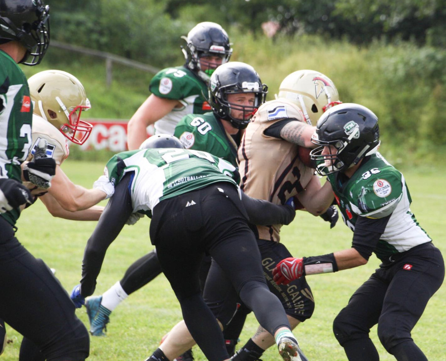 Auch Traunreut Munisier durfte keineswegs auf die leichte Schulter genommen werden. Die jüngsten Ergebnisse des Tabellenletzten deuteten auf eine steigende Form und Konsolidierung des Teams hin. Prompt setzte es auf Grund der anfänglichen Unkonzentriertheit der Spartans einen Nasenstüber: Die Heimmannschaft machte den ersten Touchdown und führte schnell mit 6:0. Die Spartans hatten den Warnschuss aber nicht bloß gehört, sondern rissen sich zusammen. Am Ende siegten die Footballer des TSV 1880 Neu-Ulm souverän und standesgemäß mit 42:6 (6:7 / 0:21 / 0:7 / 0:7).