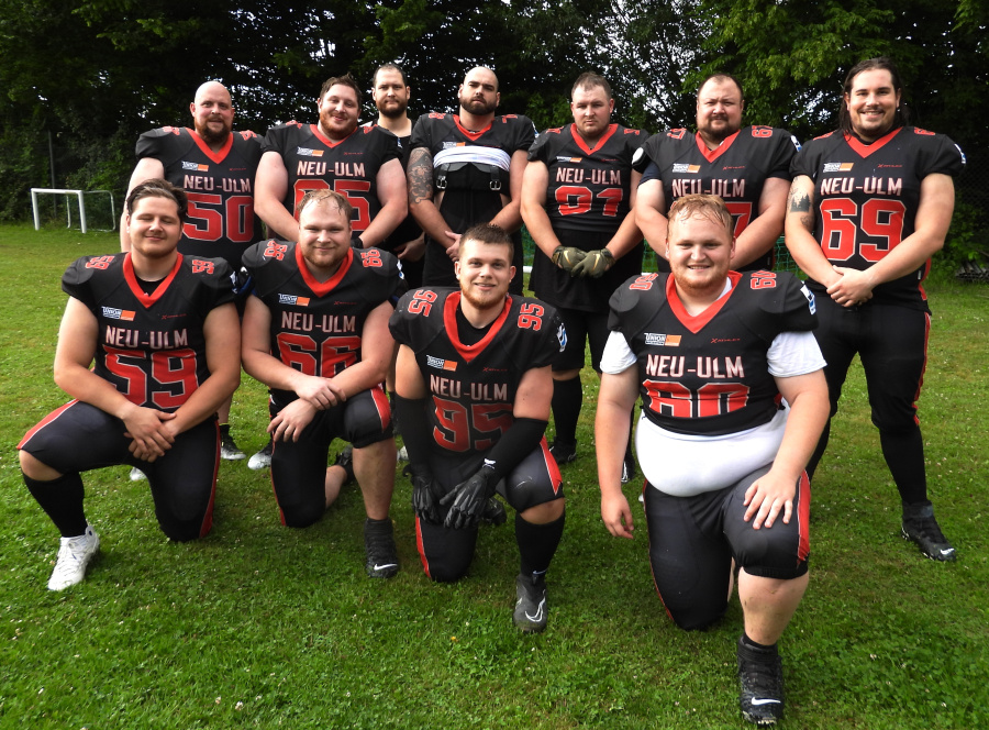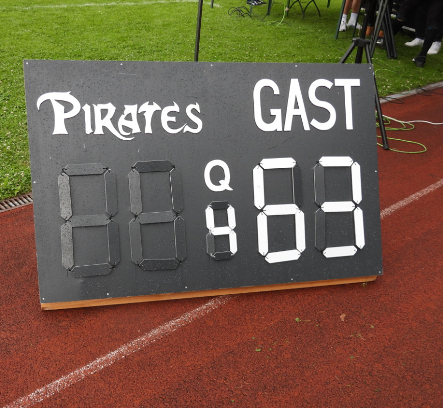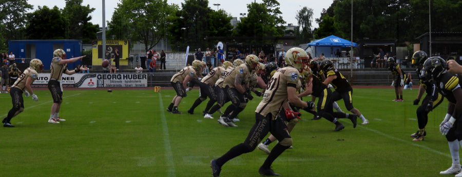 Auch Passau musste auf wichtige Akteure verzichten. Mit Quarterback Andrew Griffin und Allrounder Taivaughn Roach waren beide amerikanischen Spieler der Pirates angeschlagen und konnten nicht eingesetzt werden. Das machte das Leben für die Neu-Ulmer Defense einfacher, die aber auch keinen Zweifel ließ, dass sie auch gegen ein vollbesetztes Passauer Team die Oberhand gehabt hätte. Schon den ersten Angriff stoppte die Verteidigung im Ansatz und zwang Passau zum Punt. Zwei Spielzüge später erlief QB Sturgeon seinen ersten Touchdown (TD). Darauf folgte im ersten Viertel noch ein weiterer, dann ein tiefer Pass auf Wide Receiver Wesley Juszczak (#18 ), bevor Sturgeon seinen dritten Touchdown noch vor der Halbzeit erlief. Alle Extrapunkte verwandelte Max Walser (#56) gewohnt sicher. So stand es nach zwei Vierteln 28:00, obwohl bei nassem Wetter nicht jeder Pass gefangen wurde.