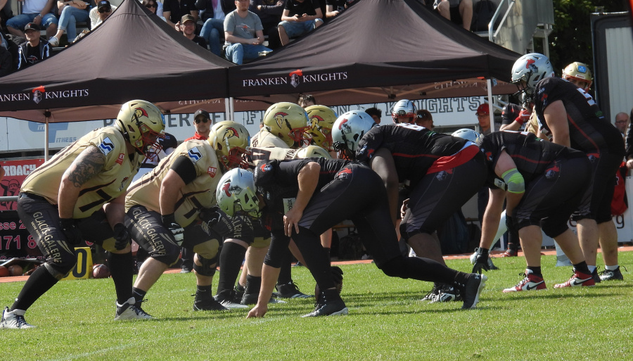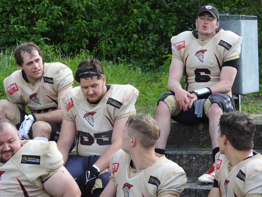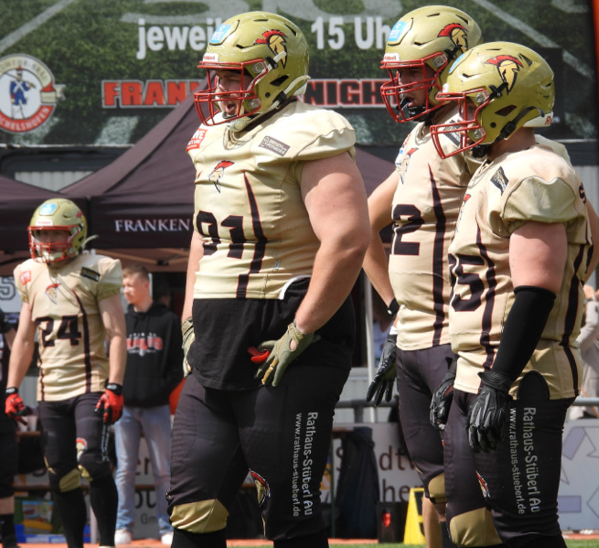 "Aus dem Mannschafts-Bus direkt in die Endzone der Franken Knights", hieß es für die Spartans, die American Footballer der TSV 1880 Neu-Ulm, beim Rückspiel in Rothenburg o. d. Tauber. Etliche Staus während der Anfahrt auf der A7 - für die 130 Kilometer brauchte das Team drei Stunden - hatten an den Nerven gezerrt und zu einigen Vorbereitungen auf der Fahrt gesorgt. So kamen die Spartans erst zwanzig Minuten vor dem geplanten Spielbeginn an. Nach Absprache mit Schiedsrichtern und Gegnern wurde der Kickoff dann zwar fünfzehn Minuten nach hinten verlegt; trotzdem blieb kaum Zeit zum Umziehen und Aufwärmen. Von den Widrigkeiten der Anfahrt zeigten sich die Neu-Ulmer völlig unbeeindruckt, schaltete ohne Federlesens auf Attacke und ließen dem Gastgeber kaum Chancen: Nach den vier mal zwölf Minuten (reine Spielzeit) stand auf dem Scoreboard: 56:13 (0:14 / 0:28 / 13:0 / 0:14) für Sparta.