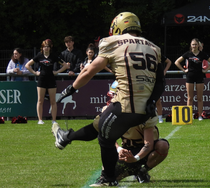 Die Spartans-Defense stoppte den Gegner sofort, und die Offense erzielte umgehend in wenigen Spielzügen den ersten Touchdown (TD). Bestens aufgelegt war wieder Running Back Ilhan Bahadir (#35). Hatte er im Hinspiel vor zwei Wochen im Muthenhölzle vier TDs erzielt, so sorgte er auch dieses Mal mit schönem Lauf für die ersten Punkte. Dass der Angriff der Spartans kaum zu stoppen war, lag aber vor allem an der Offense Line. Im Lauf blockten sie immer wieder große Lücken frei, im Pass schützten sie Quarterback (QB) Hunter Sturgeon (#6) vorbildlich. Der bedankte sich für die durch das gute Blocking gegebene Zeit mit tollen Pässen, Immer wieder auf Wide Receiver Wesley Juszczak (#18), der mit zwei TDs ebenfalls ein tragender Faktor war, aber auch auf Patrick Schempf (#9), Tobias Spohn (#81) und Luca Stieglbauer (#11).