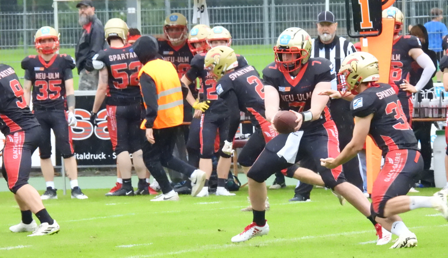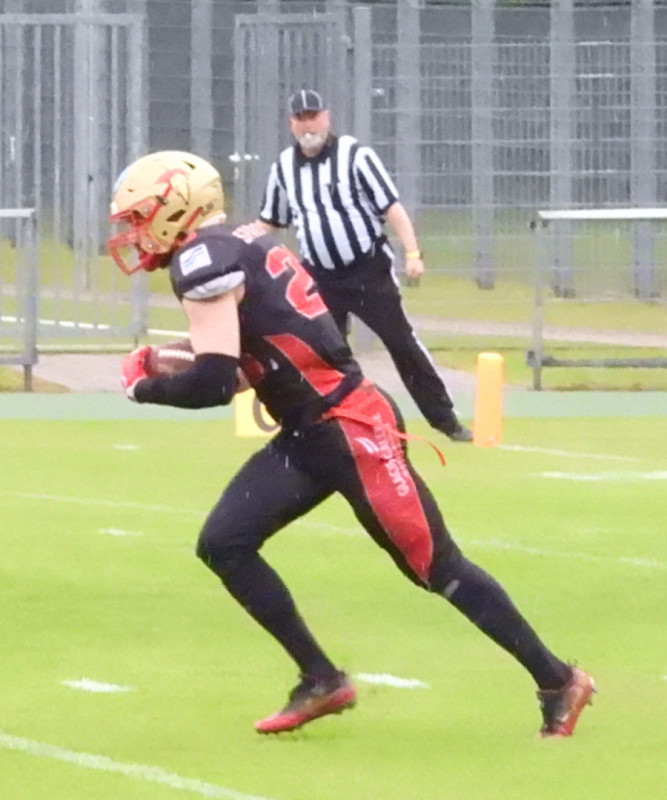 Hier zeigte sich die Stärke einerseits der Spartans Offense Line, die außerordentlich von Offense Coordinator Turner Sturgeon profitiert, der diese Positionsgruppe auch direkt trainiert, sowie andererseits die erfreuliche Tiefe auf der Running Back Position, welche viele Variationsmöglichkeiten bietet. Demzufolge steuerten auch in Landsberg Dirk Mainka (#34), Mike Höchsmann (#16) und Felix Klein (#30) allesamt tolle Läufe bei, wobei Mainka und Höchsmann je einen Touchdown erliefen, der auch ansonsten überaus agile Quarterback (QB) Hunter Sturgeon (#7) hatte mit einem ersten TD vorgelegt. Für zwei Extra-Punkte kickte Max Walser (#56) durchs Gestänge.