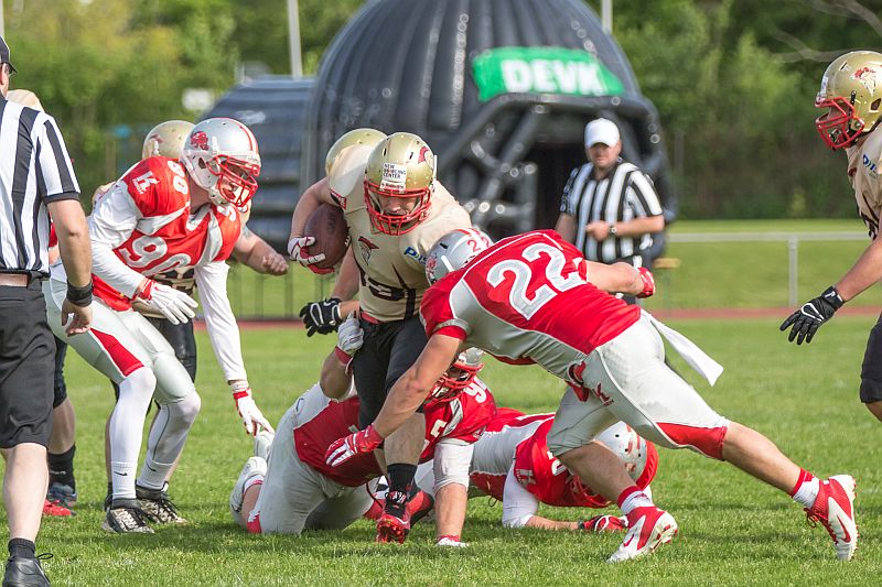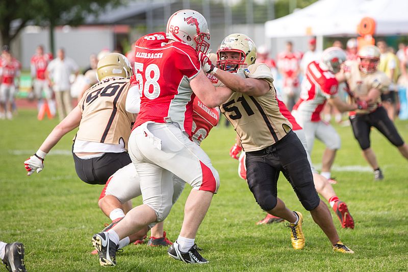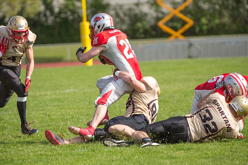 Die Partie begann direkt mit einem Paukenschlag. Beim ersten Spielzug der Razorbacks sicherte Saladin Dunnoo durch eine Interception den Ballbesitz für die Neu-Ulmer und Spartans Quarterback Robin Otto fand kurz darauf Jonas Urbanski in der Endzone, welcher mit seinem ersten Touchdown die Hausherren in Führung brachte. Die Brucker zeigten sich von diesem Rückschlag jedoch keinesfalls aus dem Konzept gebracht und setzten verstärkt auf ihr dominantes Laufspiel. In der Folge zeigten beide Teams, dass sie gewillt waren bereits früh Risiken einzugehen um an diesem Tag als Sieger vom Platz zu gehen. So wurden auf beiden Seiten vierte Versuche ausgespielt, welche jedoch oftmals von den präsenten Defensivreihen gestoppt wurden. Vor Ende des ersten Viertels bewiesen die Gäste ihre Gefährlichkeit und kamen zum 7:7 Ausgleich, nachdem die durch die linke Seite durchbrachen und über 45 Yards in die Endzone liefen. Auch im zweiten Viertel ließen beide Teams nichts an Intensität vermissen. Die Fursty Razorbacks bereiteten mit ihrem Laufspiel der Neu-Ulmer Defensive weiterhin Probleme und gingen dementsprechend nach einem Run durch die Mitte mit 14:7 in Führung. Auf Spartans-Seite arbeitete sich das Team Stück für Stück an die gegnerische Endzone. Dabei lebten die Angriffsbemühungen vor allem von der Flexibilität. Pässe auf Luca Daumenlang, Läufe durch Aleks Macanovic oder Sneaks durch Robin Otto waren für Fürstenfeldbruck nur schwer auszurechnen. Folgerichtig war es ein solcher Sneak von Robin Otto, der die Spartans aus 2 Yards zum Ausgleich brachte. Vor Pausenpfiff hatten die Gäste jedoch die Möglichkeit erneut in Führung zu gehen, doch die Abwehr um Captain Christian Vogellehner ließ keinen weiteren Touchdown zu. Die Razorbacks entschlossen sich daher mit einem Field Goal die Halbzeitführung herzustellen, doch die Defensive war erneut wachsam und konnte den Versuch blocken.