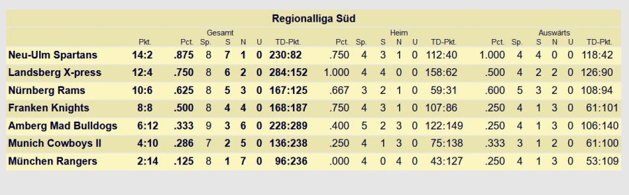 Zeit dafür ist nun genug. Die Spartans haben zwei spielfreie Wochenenden vor sich; dann allerdings geht es am 29. Juli zuerst zu einem möglichen Saison-Showdown zum aktuellen Tabellenzweiten, zum X-Press nach Landsberg, der – wie die Tabelle zeigt – mit der gefährlichsten Offense der Liga aufwarten kann. Auf der anderen Seite kann man an der Tabelle ablesen: Die Spartans haben die stabilste Defense der Gruppe. Die hat auch dafür gesorgt, dass der X-Press beim Hinspiel im Dietrich-Lang-Sportzentrum nicht wie gewohnt ins Rollen kam: Da behielt Sparta gegen den vor der Saison als Meisterschaftsfavorit gehandelten Gegner mit 25:16 die Oberhand.