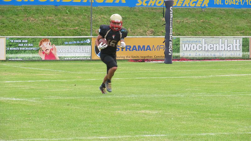 Dabei erwischten die Footballer des TSV Neu-Ulm einen rabenschwarzen Start in das Spiel. Bereits im dritten Spielzug der Partie fanden die Spiders in die Endzone der Donaustädter zur 7:0 Führung. Als die Offense der Spartans am Zug war, zeigten sich schon einige Unkonzentriertheiten, die sich den Großteil des Nachmittags hindurchziehen sollten. Besser machten es die Gastgeber, die erneut einen Fehler in der Neu-Ulmer Defensive zum 13:0 ausnutzten. Die Spiders schienen das Spiel nach Belieben zu kontrollieren. So durchbrachen sie gegen Ende des ersten Viertels gleich drei Tackleversuche der Spartans und erhöhten auf 21:0. Auch im zweiten Quarter zeigten die Straubinger den besseren Start. Durch einen erneuten Outside Run erhöhten sie auf 29:0. Es drohte ein Debakel für die Spartans, bei denen bis dato nahezu nichts zusammenlief. Gegen Mitte des zweiten Viertels gelang es den Neu-Ulmern endlich etwas Konstanz in ihr Angriffsspiel zu bringen. Robin Otto fand Fabian Schneider zum ersten Touchdown für die Spartans. Wenig später war es Pascal Liebl, der auf 29:14 verkürzte. Kurz vor der Halbzeit waren es jedoch erneut die Spiders, die durch einen Touchdown den 36:14 Halbzeitstand herstellten. In der Halbzeitpause fand Spartans Head Coach klare Worte. Scheinbar hatte die Halbzeitansprache Erfolg, denn zu Beginn der zweiten Spielhälfte wurden die Spartans stärker. Robin Otto fand erneut Pascal Liebl für einen Touchdown, bevor er kurze Zeit später selbst in die Endzone fand. Die Spartans kämpften sich bei 36:28 wieder auf einen Score heran. Nachdem zwischenzeitlich auch die Defense die Spiders stoppen konnte, schien das Spiel zu kippen. Doch die Aufholjagd sollte letztendlich vergebens sein. Die Niederbayern zogen zum Ende des 3. Viertels mit 43:28 davon. Dieser Touchdown schien die aufkommende Hoffnung im Neu-Ulmer Lager zu ersticken, denn im Schlussviertel konnten die Spartans nicht an ihre gute Phase anknüpfen. Wie zu Beginn des Spiels wurden Pässe nicht gefangen, Gegner nicht richtig geblockt und nach einem Fumble, sowie einer Interception, kamen lediglich die Gastgeber zu weiteren Punkten. Am Ende stand ein deutlicher, aber verdienter, Sieg der Straubing Spiders.