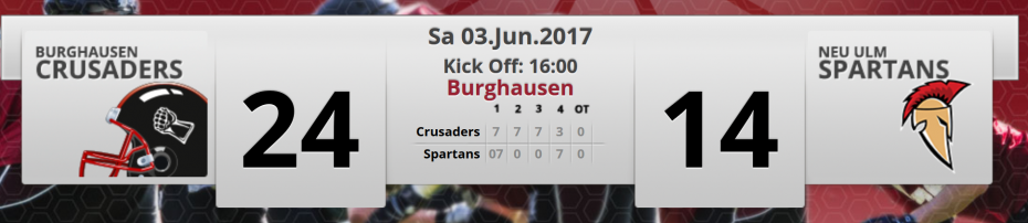 Ein nicht erfolgreicher Fieldgoal-Versuch und die Chance, kurz vor Schluss noch einen Touchdown zu erzielen, zeigen: Mit etwas Fortune wäre sogar ein Sieg an der Salzach drin gewesen. Das zeigt, wie richtig die Prognose im Vorfeld der Begegnung war: „Das wird wieder eine enge Kiste.“ Dementsprechend stöhnte der Ticker der Crusaders kurz vor Ende der Partie: „… ist das spannend …“, um dann abschließend festzustellen: „… heijeijei war das wieder ein Ritt ...“ Mit dem Platztausch wurde es also nichts – die Crusaders bleiben Dritter und die Spartans dahinter Vierter.