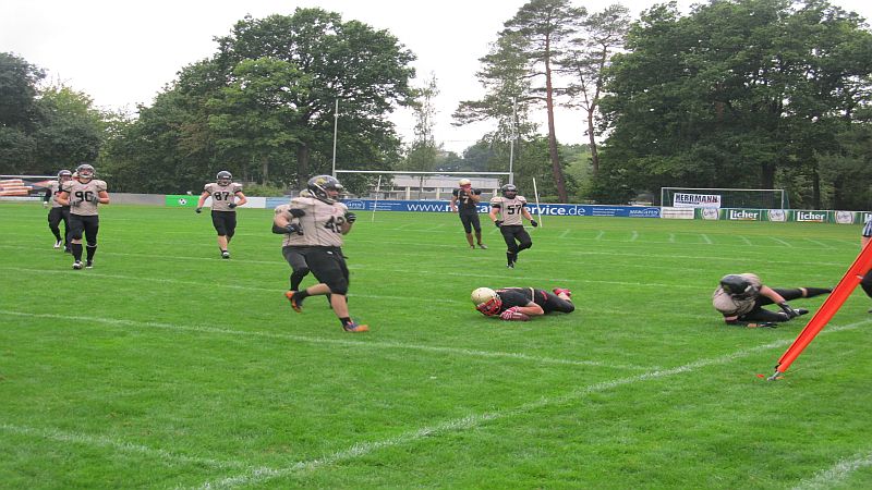 Bereits in der ersten Angriffsserie gingen die Gastgeber durch einen Touchdown-Pass mit 7:0 in Führung. Mehr Probleme hatte die Spartans Offense, deren Laufspiel immer wieder durch die präsente Gießener Verteidigung gestoppt wurde. Doch die Spartans Defense fand besser ins Spiel und konnte sich besser auf die Angriffe der Golden Dragons einstellen, was mehrere Wechsel des Angriffsrechts zur Folge hatte. Zum Ende des ersten Viertels kamen die Gastgeber durch einen rund 40 Yard Pass, sowie einen starken Lauf an die 1 Yard-Linie der Spartans. Doch die Verteidigung konnte, unter anderem durch Michael Wiedenmann und Tobias Huber, einen weiteren Touchdown verhindern, so dass die Golden Dragons lediglich durch ein Field Goal auf 10:0 erhöhten. Langsam schien auch die Offensive der Gäste ins Spiel zu finden. Nach einem langen Pass auf Pascal Liebl fanden sich die Neu-Ulmer an der 25 Yard-Linie der Gießener. Jedoch hielt auch die Gießener Verteidigung, und die Spartans versuchten sich ihrerseits an einem Field Goal. Leider verfehlte Steffen Ganghof die Pfosten knapp und es blieb beim 10:0. Bei einem 3. Versuch und 30 nutzten die Hessen einen Abstimmungsfehler im Neu-Ulmer Backfield, fanden die Lücke und erzielten einen Touchdown zur 17:0 Halbzeitführung. Im zweiten Spielabschnitt gestaltete sich das Spiel ausgeglichener. Die Donaustädter Offensive um Robin Otto trat flexibler auf und arbeitete sich in Richtung gegnerische Endzone, doch im entscheidenden Moment wurde der Ball durch die präsente Gießener Verteidigung abgefangen. Etwas später waren die Spartans erneut in Field Goal Reichweite, doch bei diesem Versuch missglückte der Snap und die Golden Dragons sicherten sich den Ball. Mit diesem Ballbesitz liefen die Hessen an die Endzonde der Bayern und erzielten kurz darauf das 24:0. Im Schlussviertel drängten die Spartans darauf Punkte zu erzielen, doch auch der dritte Field Goal Versuch brachte keine Zähler auf das Scoreboard. Der Kick wurde durch die starken Golden Dragons geblockt. Die Spartans Defensive gab alles um den Ball möglichst schnell zurück zu erobern, doch die Gießener kamen nach einem erfolgreichen Fake Punt erneut an die Endzone der Neu-Ulmer. Jedoch war die Defensive um Christian Vogellehner präsent und sicherte durch ein Fumble bei rund 2 Minuten Spielzeit das erneute Angriffsrecht. Robin Otto führte die Spartans mit der Aussicht die Ausgangslage für das Rückspiel etwas zu verbessern, doch erneut wurde der Ball kurz vor der gegnerischen Endzone interceptet. Dies besiegelte die 24:0-Niederlage der Spartans.