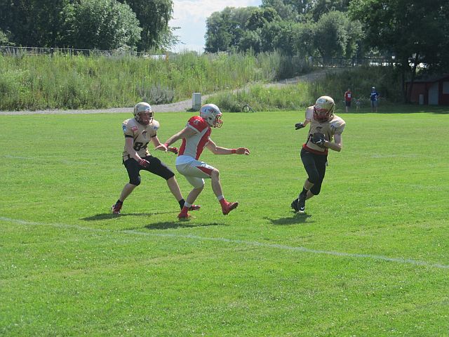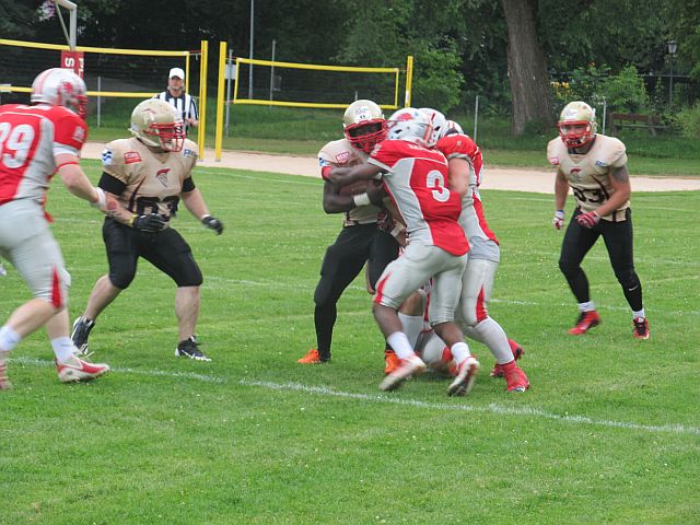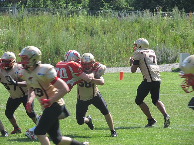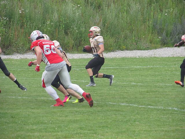 Es gibt einfach Tage, an denen einem nichts gelingt und dem Gegner alles. Einen solchen erwischten die Footballer des TSV Neu-Ulm bei ihrem Gastspiel in Fürstenfeldbruck. Während die Gastgeber bei nahezu jedem Ballbesitz Punkte erzielten, konnten die Donaustädter zwar lange mithalten, mussten sich am Ende jedoch geschlagen geben. Zu Beginn der Partie entwickelte sich ein Spiel auf Augenhöhe. Gingen die Razorbacks mit ihrem ersten Ballbesitz in Führung, glichen die Spartans durch Lasse Bartels direkt aus. Schaffte Fursty einen Touchdown mit 2-Point Conversion, gelang Robin Otto das selbe. Erst gegen Ende der ersten Halbzeit konnten die Razorbacks etwas davonziehen, nachdem es ihnen erstmals gelang die Spartans zum Punt zu zwingen. In der zweiten Spielhälfte entwickelten die Brucker ein Übergewicht und zogen davon. Zwar ging die Spartans Offensive oftmals auf volles Risiko und wurde belohnt, etwa mit tiefen Pässen bei vierten Versuchen und einem erfolgreichen Onside-Kick, doch die ersatzgeschwächte Defensive konnte dem Druck der Razorbacks nichts entgegensetzen. Während die Gastgeber weiter punkteten, fand bei den Spartans lediglich Luca Daumenlang zweimal den Weg in die Endzone. Entsprechend deutlich stand am Ende das Ergebnis von 50:27 und die Tabellenspitze für die Fursty Razorbacks.