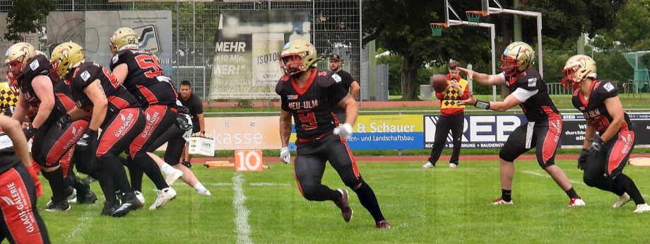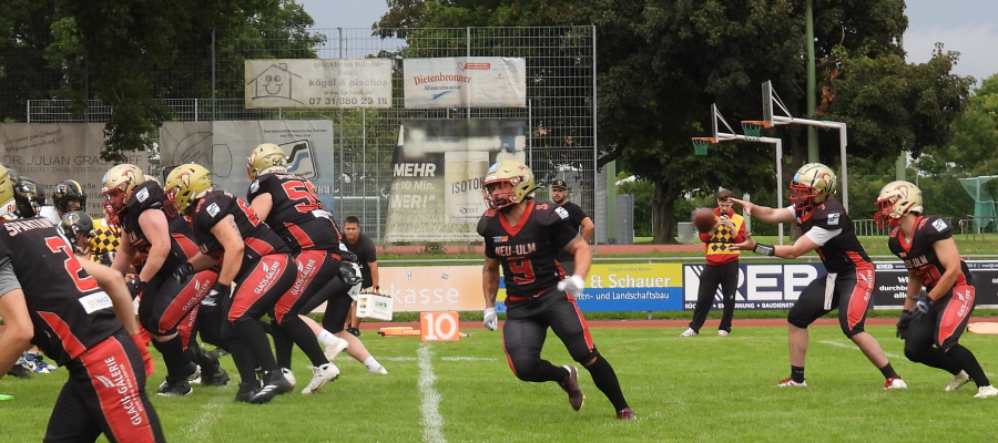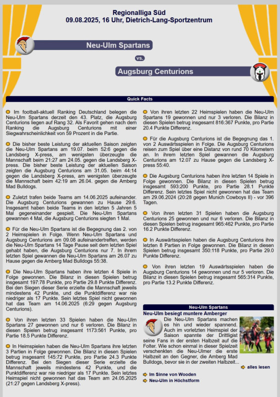 An diesem Samstag, 09. August (Kickoff: 16 Uhr) kommt es zum Gipfeltreffen in der Football-Regionalliga Süd: Die auf dem zweiten Tabellenplatz rangierenden Neu-Ulm Spartans empfangen im Muthenhölzle den bislang in der Saison ungeschlagenen Spitzenreiter: die Augsburg Centurions. Stünde da nicht die absolut unnötige Heim-Niederlage (21:27) des American Football-Team im TSV Neu-Ulm zu Buche gegen den im Rückspiel in Landsberg dann mit 52:6 mehr als deutlich geschlagenen X-Press, hätten die Neu-Ulmer noch eine Chance gehabt, mit dem Liga-Primus die Position zu tauschen. Voraussetzung wäre: Die Spartans bringen 23 Punkte mehr aufs Scoreboard als der Gegner (Spartans-Niederlage im Hinspiel nach Verletzung bereits im ersten Quarter von Quarterback Hunter Sturgeon mit 6:29). Hätte, wäre – die Chance ist nicht mehr gegeben, aber auf jeden Fall wollen die Footballer im TSV Neu-Ulm die Saison mit zehn Siegen und nur zwei Niederlagen abschließen und zeigen, dass sie auch die Centurions schlagen können.