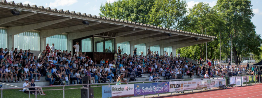 Das Header-Foto zeigt die gut besetzte Tribüne in der Spartans Football Arena beim Heimspiel gegen die München Rangers in der Saison 2017