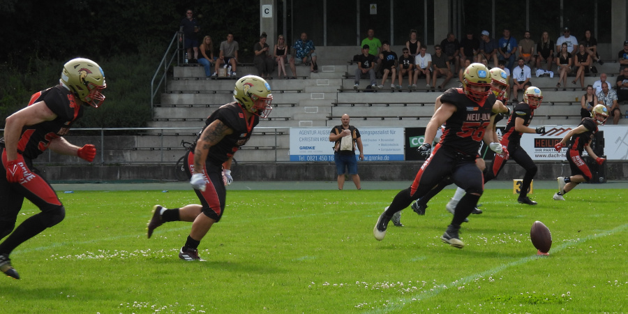 Wer zum Auswärtsspiel der Neu-Ulm Spartans in Landsberg drei Minuten zu spät kam, hatte das Beste schon verpasst: Der Wide Receiver Wesley Juszczak (#18) trug den Eröffnungskickoff direkt zum Touchdown zurück, Extrapunkt (PAT) Max Walser (#56) und es stand im Regionalliga-Meisterschaftsspiel 7:0 für das Team des TSV 1880 Neu-Ulm. Hochgeschwindigkeits-Football, bei dem das ganze Spiel über der X-Press nicht zum Zug kam, immer wieder gebremst wurde und schließlich eine, mindestens in dieser Höhe etwas unerwartete, Niederlage hinnehmen musste. Zum Schluss hieß es 6:52 (6:14/ 0:17 / 0:0 / 0:21).