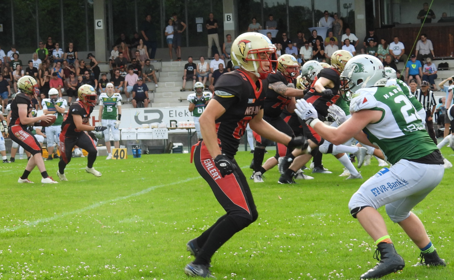 Aber dann – im vierten Spielabschnitt erlief Hunter Sturgeon einen TD, verteilte den Ball gut an seine Receiver Wesley Juszczak, Patrick Schempf (#9) und Tobias Spohn (#81) und Running Back Felix Klein (#30) krönte seine sehr gute Leistung mit einem Lauf-TD sowie mit einem gefangenen TD nach Pass von Sturgeon. Linebacker Max Walser verwandelte alle drei PAT gewohnt zuverlässig und verhinderte darüber hinaus einen weiteren Landsberger Punt im Ansatz, indem er den Punter zu Boden brachte, bevor dieser den Ball los werden konnte.