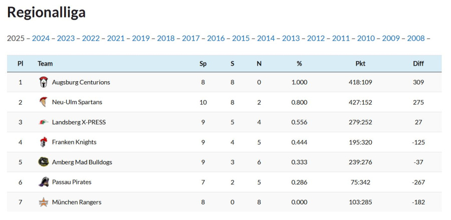 Die beiden letzten Spiele dürfen die Spartans auf heimischen Grund im Dietrich-Lang-Sportzentrum austragen. Dazu kommen zuerst am nächsten Samstag, 26. Juli (Kickoff: 16 Uhr) die im Hinspiel mit 50:24 besiegten Amberg Mad Bulldogs nach Neu-Ulm. Und am Samstag, den 9. August (Kickoff 16 Uhr) wird der noch ungeschlagene und nicht mehr von der Spitze zu verdrängende Tabellenführer, Augsburg Centurions, erwartet, der im Hinspiel in der Fuggerstadt mit 29:6 deutlich die Oberhand behalten hatte. Trotzdem ist das Ziel der Spartans, eine „perfect season“ des mit Zugängen aus höheren Spielklassen und mit Imports gespickten Aufstiegs-Kandidaten zu verhindern. Da ist dann Spannung garantiert