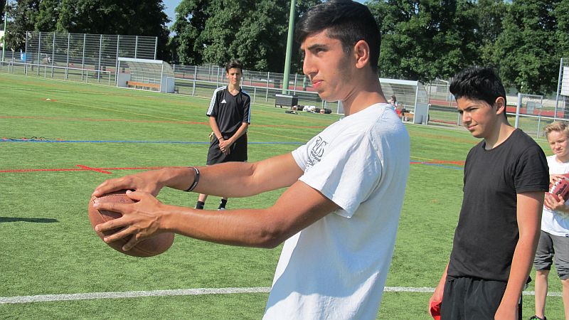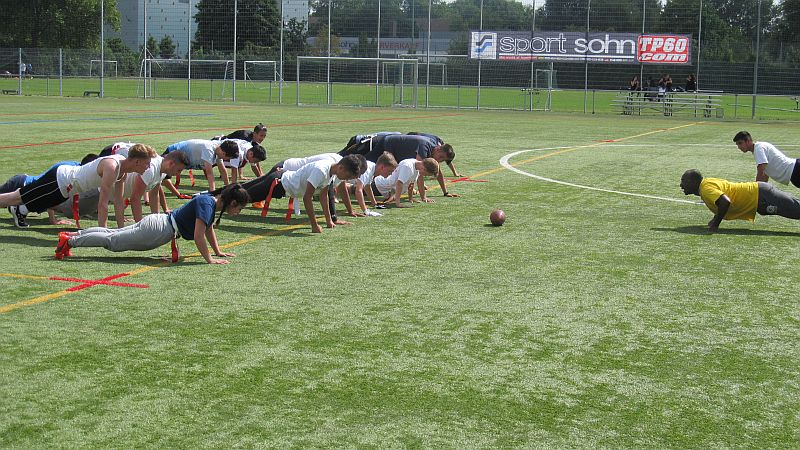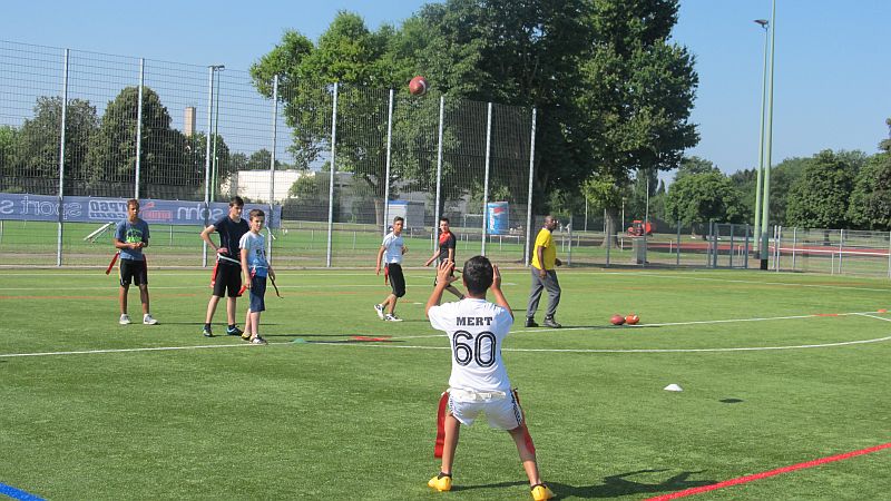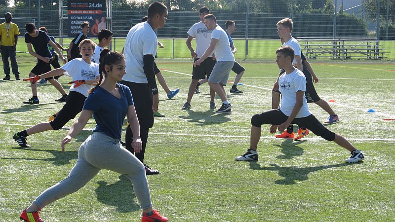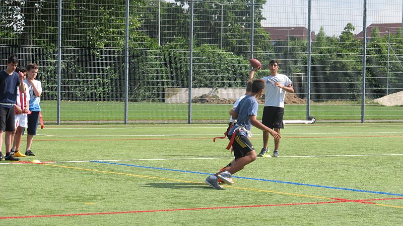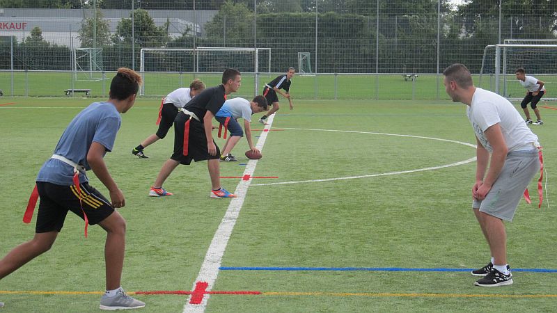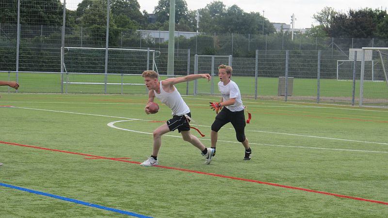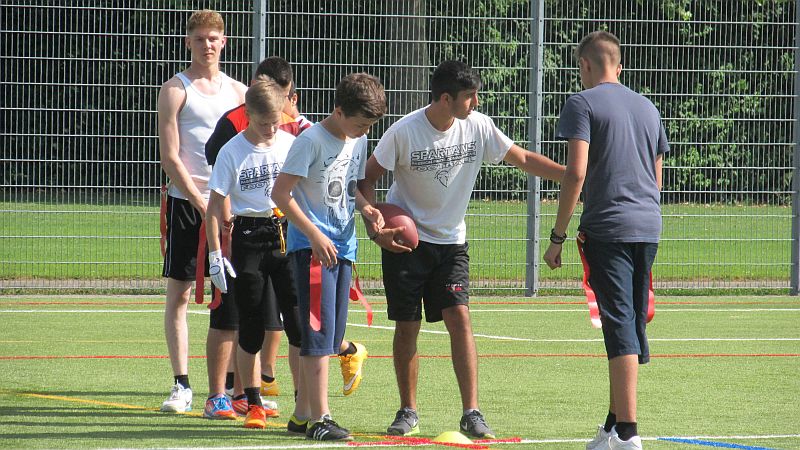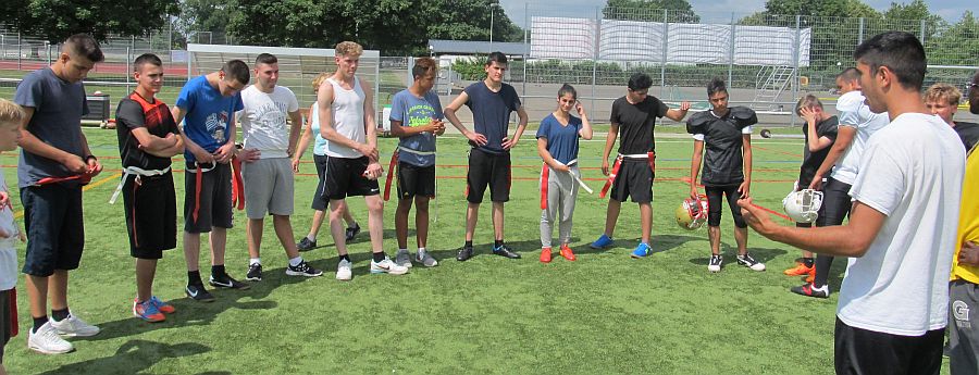 American Football liegt an der Donau derzeit im Trend. Aus diesem Grund fragte die Anna-Essinger-Realschule Ulm bei den Spartans an, ob diese sich an deren Trendsporttag beteiligen würden. Selbstverständlich sagten die Footballer des TSV Neu-Ulm zu und veranstalteten für die rund 20 Interessierten am gestrigen Mittwoch eine eigene Trainingseinheit. Unter der Leitung von Jugend-Coach Richard Addison und Senior-Spieler Saladin Dunoo erhielten die Schülerinnen und Schüler Einblicke in diesen spannenden Sport. Nach einer kurzen Regelkunde, folgte ein ausgiebiges Aufwärmprogramm, bevor in mehreren Gruppen verschiedene Positionen ausprobiert werden konnten. Um ein mögliches Verletzungsrisiko zu minimieren und den Fokus auf die Athletik zu legen, entschieden sich die Spartans für diverse Offense- und Defenseübungen des Flag Football. So lernten die Jugendlichen unter anderem das sichere Fangen, den korrekten Pass, sowie mehrere Abwehrmöglichkeiten und -techniken. Gegen Ende des rund zweieinhalbstündigen Trainings veranstalteten die Realschüler natürlich ein kleines Trainingsspiel. Als Abschluss eines gelungenen Sporttages hatten die Spartans noch eine kleine Überraschung parat. Jeder Teilnehmer erhielt ein kleines Geschenk und eine Einladung zum kommenden Heimspiel am 25.07. gegen die Landsberg X-Press.