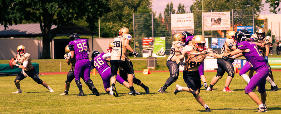 Dadurch hatten die Spartans schließlich dann auch das bessere Ende für sich, denn die eigene Offense blieb jederzeit variabel und mit Lauf und Pass gefährlich. Im Laufspiel war es vor allem wieder Dirk Mainka (#34), der frisch erholt aus dem Urlaub, starke Yards am Boden und einen Touchdown machte. Ebenso steuerte Hunter Sturgeon (#7) direkt den ersten Touchdown der Spartans zu Fuß bei, bevor er später tatsächlich drei Mal Patrick Schempf (#9) per Pass zum Touchdown bediente. Schempf, letztes Jahr noch als Linebacker in der Defense, ist somit aktuell der gefährlichste Passempfänger auf Seiten der Spartans. Alle fünf Extrapunkte wurden von Max Walser (#56) sicher erzielt