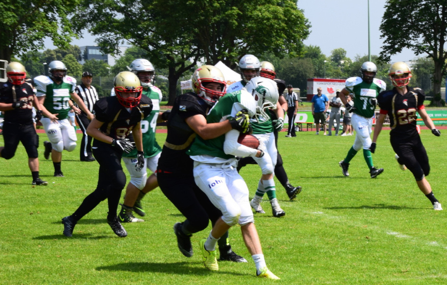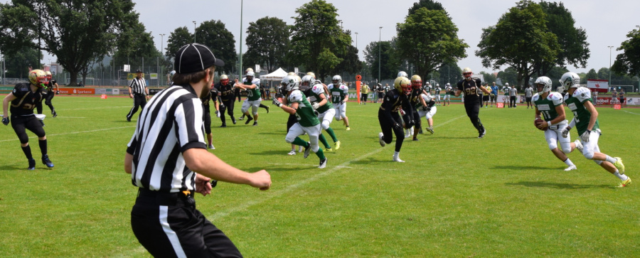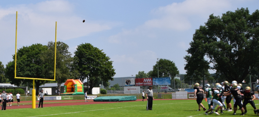 Zum Spiel-Beginn sah es allerdings nicht unbedingt danach aus. Ein nicht festgehaltener Ball – und der X-Press nutzte diesen Fumble direkt zu einem Touchdown. Auch den Extrapunkt konnten die Gäste nach gelungenem Kick durch die Stangen für sich verbuchen. Der schnelle 0:7-Rückstand schockte die Hausherren nur mäßig. Während des gesamten Matches agierte die Defense absolut überragend, ließ den X-Press überhaupt nicht mehr ins Rollen kommen, sondern stoppte ihn regelmäßig äußerst effektiv und ließ keinen weiteren Punkt mehr zu.